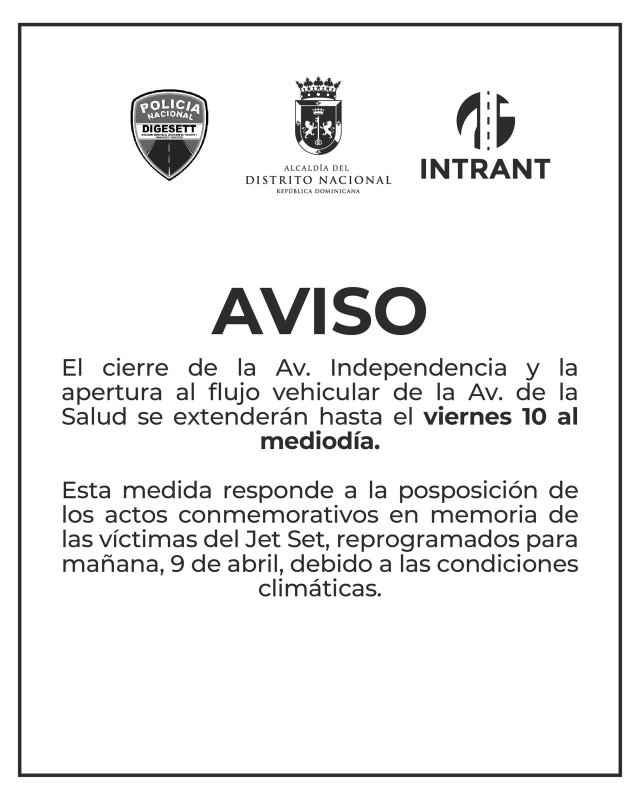 La medida se produce debido a la posposición este miércoles de los actos conmemorativos del primer aniversario de la tragedia de la discoteca Jet Set, debido a las intensas lluvias que afectaron al Distrito Nacional desde horas de la madrugada.