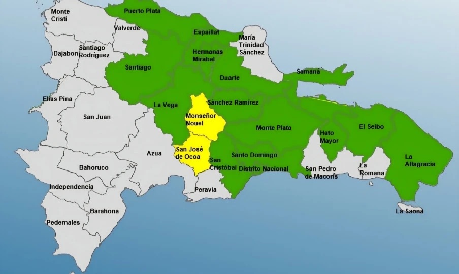 En alerta verde se encuentran Santo Domingo, Distrito Nacional, Sánchez Ramírez, Hermanas Mirabal, Puerto Plata, San Cristóbal, Santiago, Espaillat, Duarte, Samaná, La Vega, La Altagracia, Monte Plata, Hato Mayor y El Seibo.