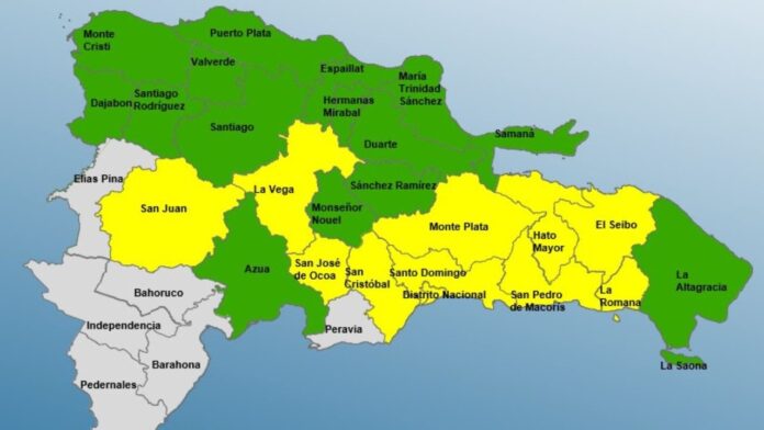 En alerta amarilla se encuentran La Vega, San José de Ocoa, Monte Plata, San Pedro de Macorís, Santo Domingo, el Distrito Nacional, San Juan, El Seibo, La Romana, Hato Mayor y San Cristóbal.