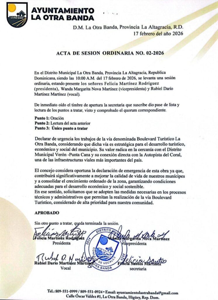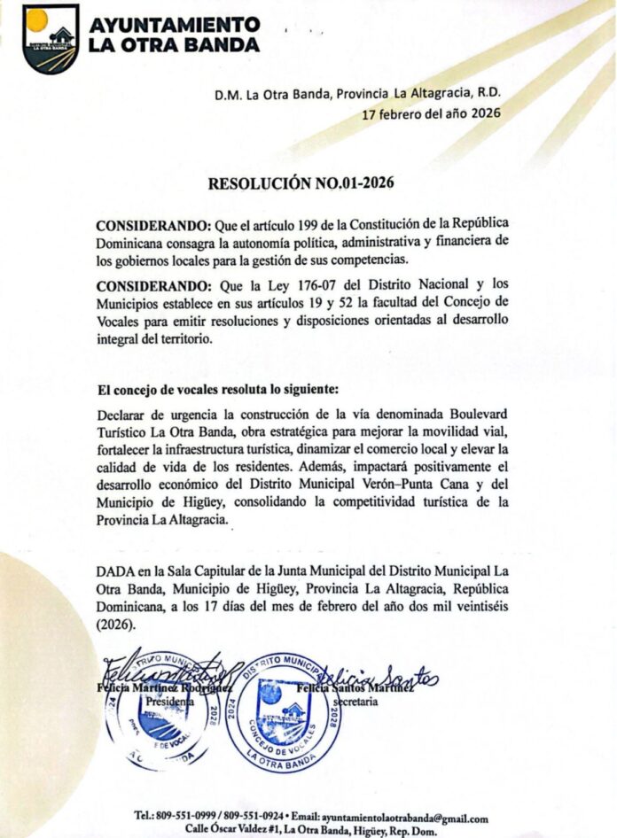 Con esta resolución, el Concejo y la Alcaldía consolidan una visión de desarrollo sostenible que posiciona a La Otra Banda como un punto estratégico dentro del crecimiento turístico y económico de la provincia La Altagracia.