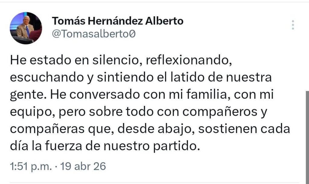 “He estado en silencio, reflexionando, escuchando y sintiendo el latido de nuestra gente. He conversado con mi familia, con mi equipo, pero sobre todo con compañeros y compañeras que, desde abajo, sostienen cada día la fuerza de nuestro partido”,